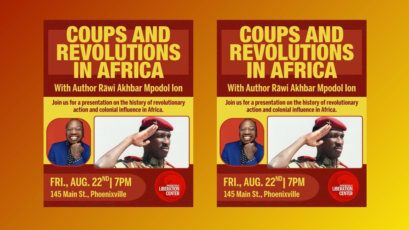 Join us at the Phoenixville Liberation Center to hear from author Rāwi Akhbar Mpodol lon on the history of revolutionary action and colonial influence in Africa.