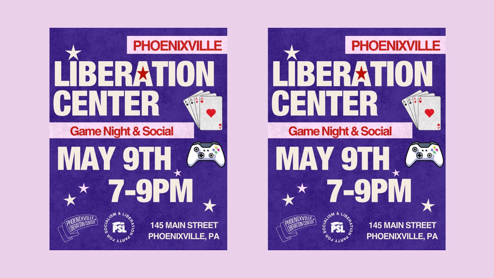 Join us at the Phoenixville Liberation Center for a game night & social. Meet folks who are dedicated to seeing progressive change in their communities while playing card games, board games and video games. As we struggle to build a movement capable of ushering in a new system based on peace and meeting peoples needs, we also work to building community through recreation and fun. See you there!