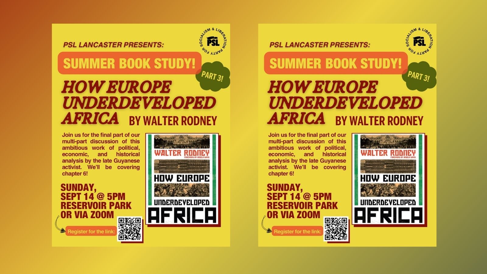 Join us in-person OR virtually on Sunday 9/14 at 5pm for the final part of our Summer Book Study. We’ll be covering the last chapter, chapter 6, of Walter Rodney’s How Europe Underdeveloped Africa!